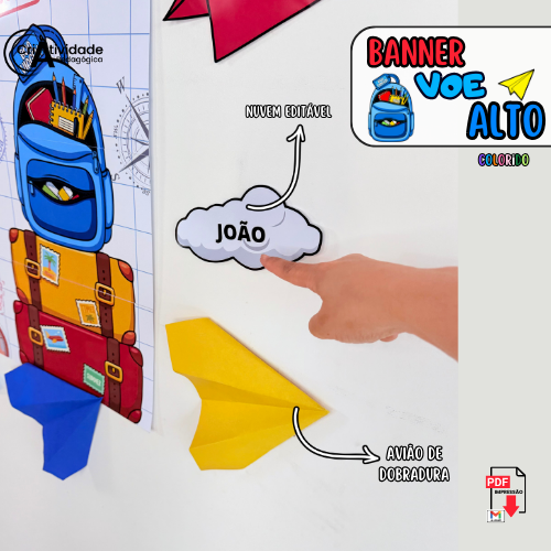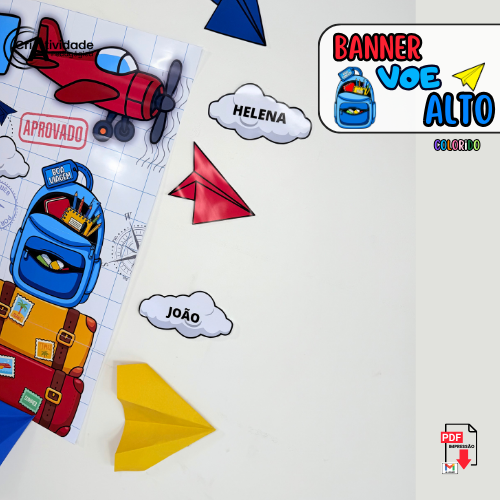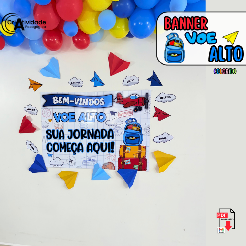 O Banner Voe Alto é um recurso digital em PDF, pronto para aplicar e fácil de montar. Com o tema Voe Alto, traz um visual acolhedor e inspirador para receber os alunos. Em versão colorida, é perfeito para a volta às aulas.