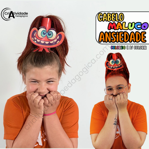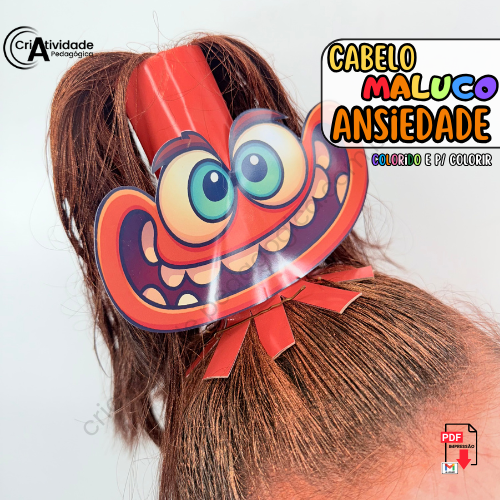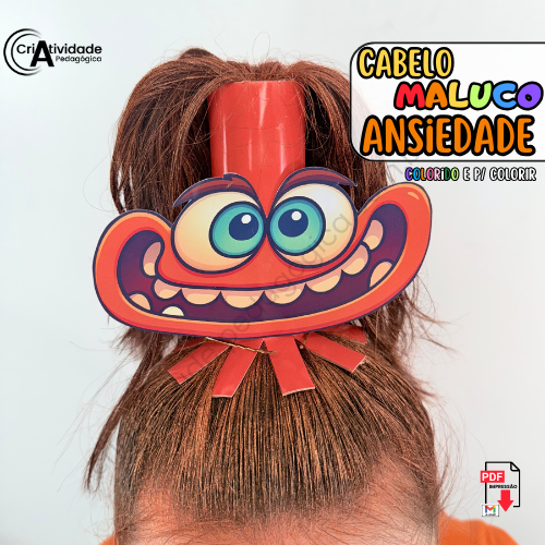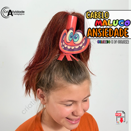 O Cabelo Maluco Ansiedade é um recurso digital em PDF, pronto para aplicar e fácil de usar. Inspirado na personagem de Divertidamente, utiliza rolinhos de papel toalha para compor o cabelo divertido. Disponível em colorido e para colorir, é ideal para professores e pais.