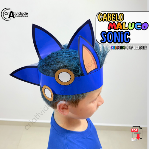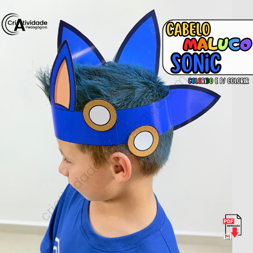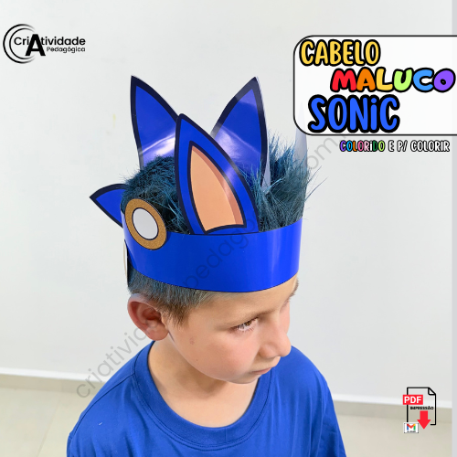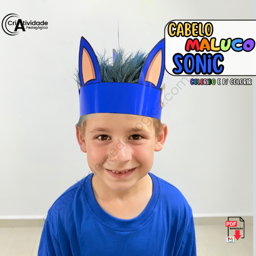 O Cabelo Maluco Sonic é um recurso digital em PDF, pronto para aplicar e fácil de usar. Em formato de coroa, simula as orelhas e os espinhos do personagem, criando um visual criativo. Disponível em colorido e para colorir, é ideal para professores e pais.