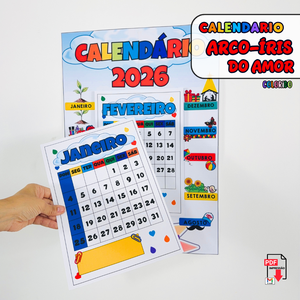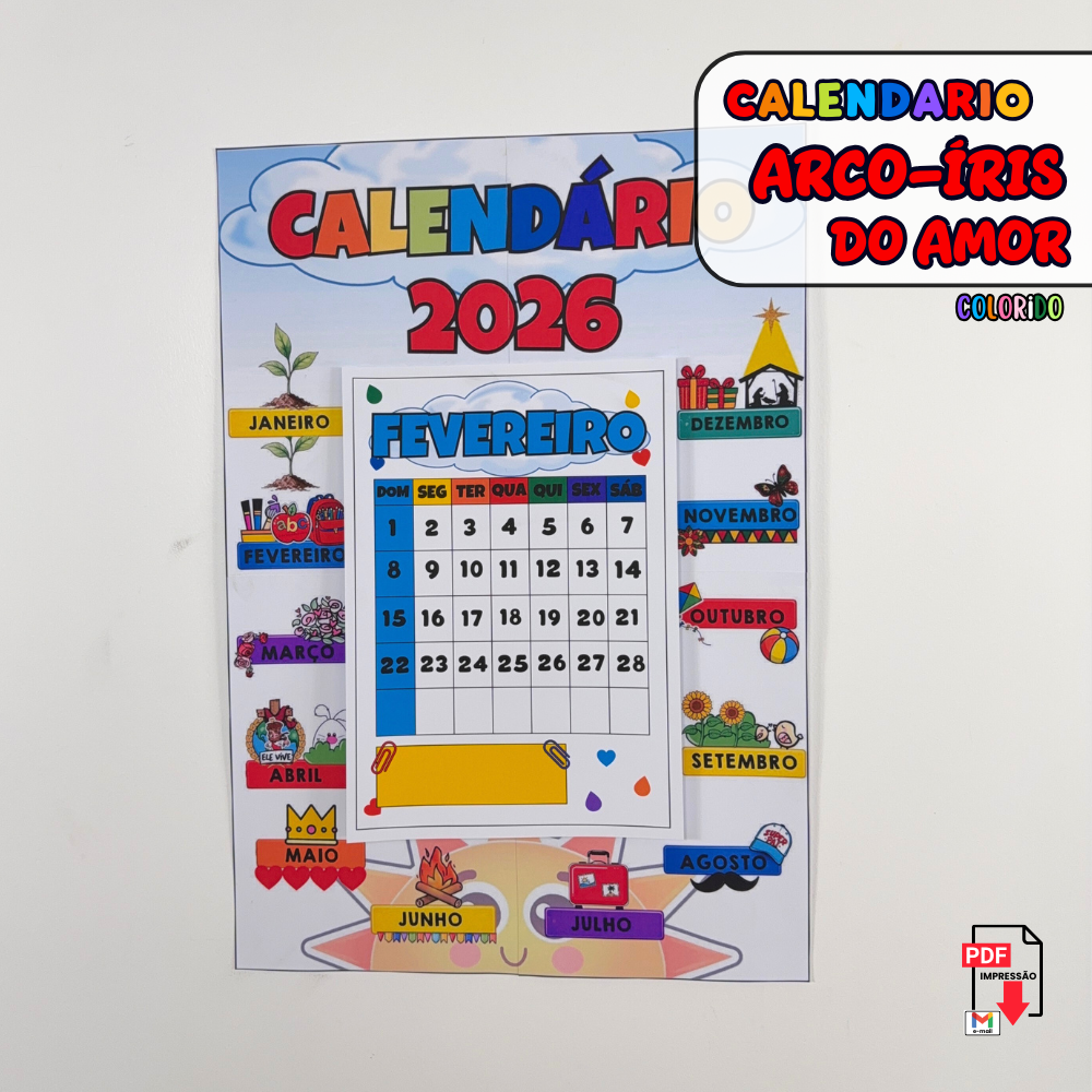O Calendário Arco-Íris do Amor é um recurso digital em PDF, pronto para aplicar e muito fácil de usar em sala de aula. Desenvolvido com o tema Arco-Íris do Amor, o calendário auxilia na organização da rotina escolar de forma lúdica, acolhedora e visual. Ideal para trabalhar meses, dias da semana, datas importantes e noção de tempo, tornando o aprendizado mais significativo para as crianças. O visual colorido e harmonioso contribui para um ambiente que valoriza afeto, respeito e convivência. Perfeito para murais, cantinhos pedagógicos e rotina diária, facilita a compreensão da passagem do tempo. Disponível em versão colorida, é prático para impressão e uso imediato. Produzido com alta qualidade visual e pedagógica, é um recurso essencial para a organização da sala.