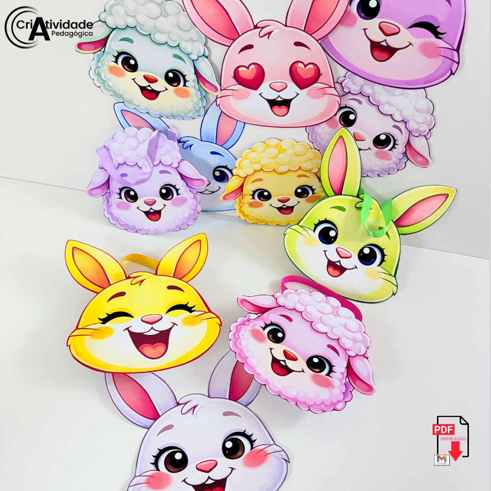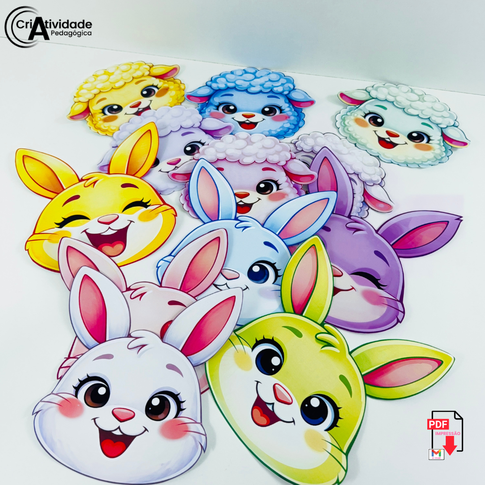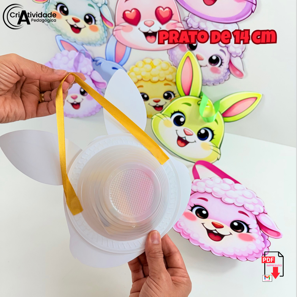A Cesta Turma da Páscoa é um recurso digital em PDF, pronto para aplicar. Possui personagens de coelho e cordeirinho, ideal para colocar guloseimas. Em versão colorida, é perfeita para lembrancinhas de Páscoa.