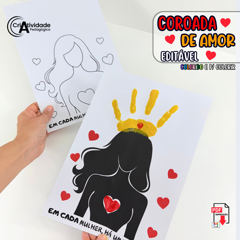 A Coroada de Amor é um recurso digital em PDF, pronto para aplicar e editável. Utiliza carimbo de mãos para formar uma coroa e um coração no peito da mulher. Em versão colorida, é ideal para homenagens no Dia da Mulher.