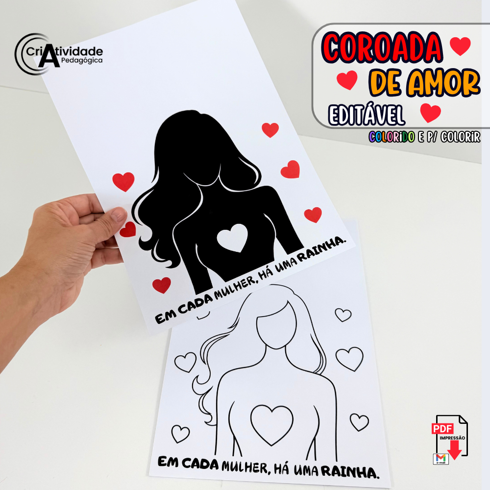 A Coroada de Amor é um recurso digital em PDF, pronto para aplicar e muito fácil de usar em ações comemorativas do Dia da Mulher. A proposta utiliza o carimbo das mãos para formar uma coroa e, com os polegares, criar um coração no peito da mulher, simbolizando amor, força e valorização. O material é editável, permitindo personalizar conforme a proposta da turma ou da escola. Ideal para projetos de homenagem, atividades artísticas e momentos de reflexão, promove participação ativa e expressão afetiva. O resultado final se transforma em uma produção significativa e emocionante. Disponível em versão colorida, é prático para impressão e aplicação. Produzido com alta qualidade visual e pedagógica, é um recurso que une arte, afeto e reconhecimento.