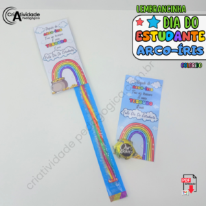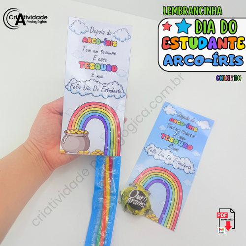 Surpreenda e emocione os alunos com a Lembrancinha Dia do Estudante – Arco-Íris! Com o tema cheio de cor e significado, a lembrancinha traz a frase especial: “Depois do arco-íris tem um tesouro, e esse tesouro é você. Feliz Dia do Estudante”, reforçando como cada criança é valiosa e única. O mimo pode incluir um doce, como uma balinha ou bombom, tornando o presente simples, mas cheio de afeto e alegria. Uma lembrança cheia de cores e carinho para celebrar os estudantes em sua essência! 🎁🌟🍬