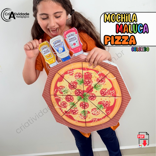 A Mochila Maluca Pizza é um recurso digital em PDF, pronto para aplicar e fácil de usar. Permite revestir uma caixa de papelão, transformando-a em uma mochila criativa e divertida. Em versão colorida, é ideal para o Dia da Mochila Maluca.
