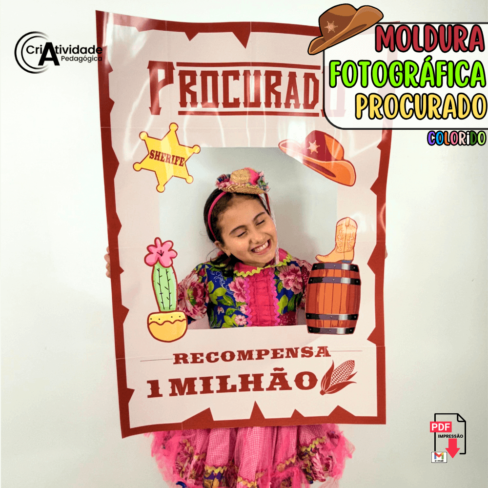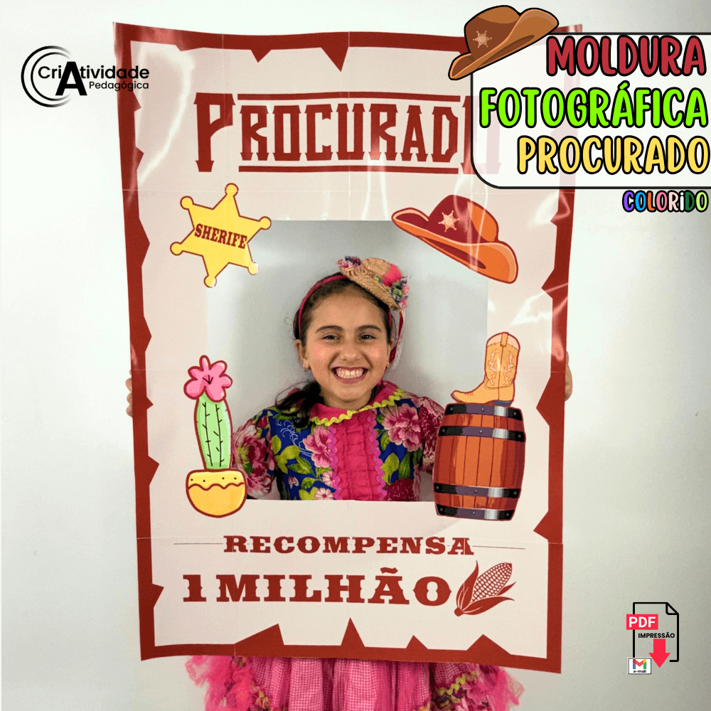 A Moldura Fotográfica Procurados é um arquivo digital que permite criar uma moldura de bambolê com estilo de cartaz de procurados. Perfeita para fotos divertidas em eventos temáticos, proporciona interação e alegria. Fácil de usar e cheia de personalidade, é ideal para professores que desejam enriquecer suas atividades escolares com criatividade. Faça das fotos uma experiência inesquecível e cheia de estilo!