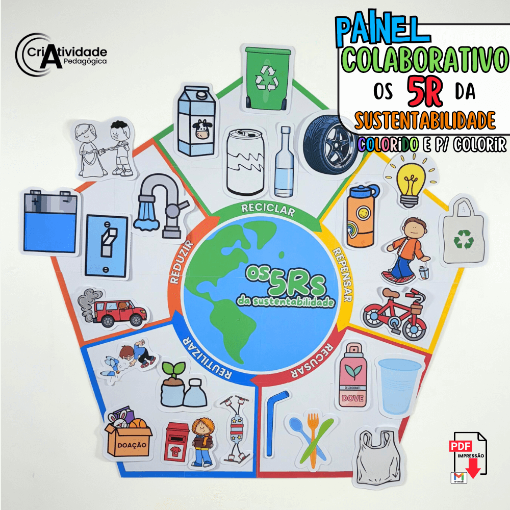 O Painel Colaborativo Os 5R da Sustentabilidade é um arquivo digital que ensina sustentabilidade de maneira prática e envolvente. As crianças colam ações para cada um dos 5R, criando um mural interativo. Promove a responsabilidade ambiental de forma criativa e colaborativa. Perfeito para professores que desejam integrar a educação ambiental nas aulas. Incentive uma nova geração a cuidar do planeta com este painel educativo!