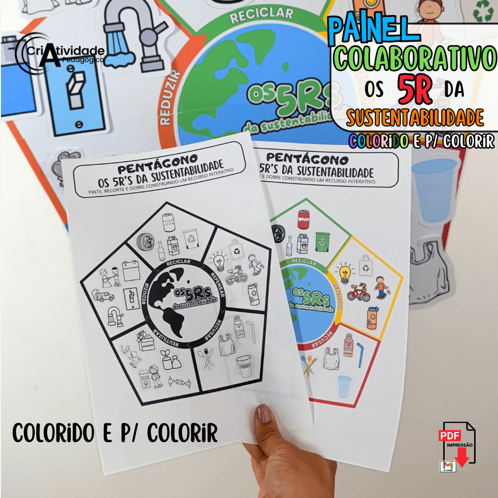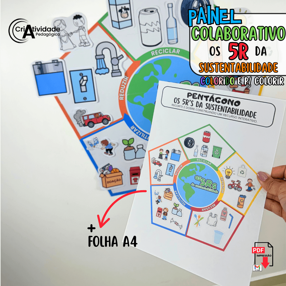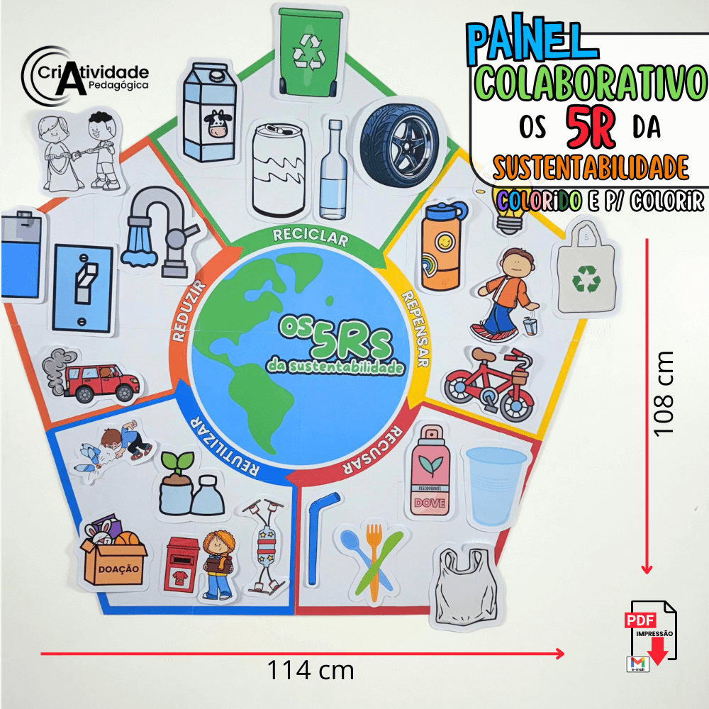 Inspire a consciência ambiental com o Painel Colaborativo Os 5R da Sustentabilidade! Este painel educativo envolve as crianças de forma interativa e colaborativa, ensinando os princípios de Repensar, Reduzir, Reutilizar, Reciclar e Recusar. As crianças podem colar suas próprias ações e ideias para cada R, promovendo o aprendizado ativo e a criatividade. Ideal para atividades que incentivam a participação e o senso de responsabilidade ambiental. Transforme o conceito de sustentabilidade em uma experiência prática e enriquecedora. Faça do aprendizado um movimento ecológico com este painel inovador!