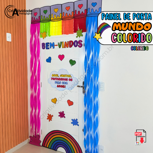 O Painel de Porta Mundo Colorido é uma decoração criativa para a volta às aulas. Com cores vibrantes, pincéis, tintas e a frase “Aqui, juntos, pintaremos os dias com amor!”, esse painel é perfeito para acolher os estudantes com carinho. Fácil de montar e cheio de vida, ele transforma a entrada da sala em um espaço cheio de inspiração, deixando todos empolgados para recomeçar.