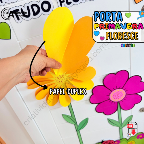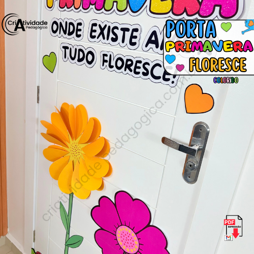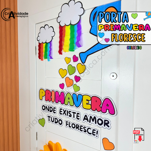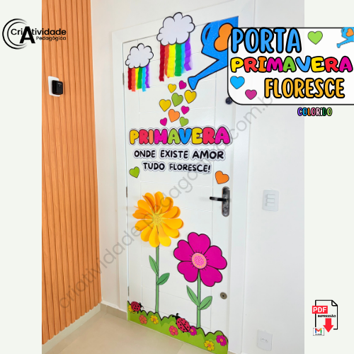 O Painel de Porta: Primavera Floresce transforma a entrada de qualquer espaço em uma verdadeira celebração à primavera! Com a frase inspiradora “Primavera, onde existe amor, tudo floresce”, ele é decorado com um colorido arco-íris de papel crepom e flores feitas com papel duplex ou outros materiais alternativos. A combinação de elementos vibrantes e criativos cria uma entrada acolhedora e cheia de vida, ideal para escolas ou eventos ligados à estação. Com cores e amor, este painel dá as boas-vindas à primavera de forma encantadora! 🌈🌺🌿