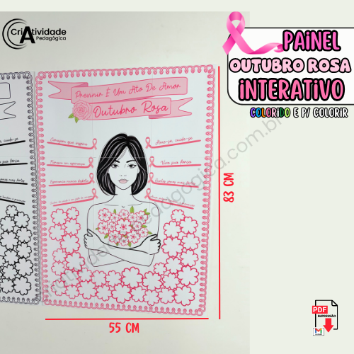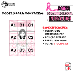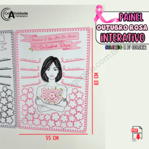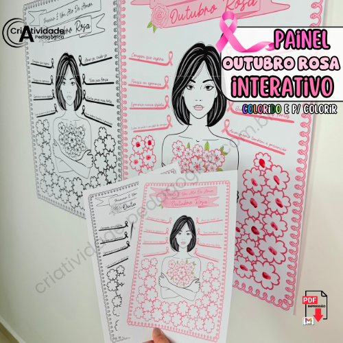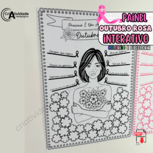 O Painel Outubro Rosa Interativo é um recurso digital em PDF de 9 folhas, pronto para aplicar. Disponível em colorido e para colorir, permite que as digitais com guache formem flores em um jardim de força, amor e cumplicidade.