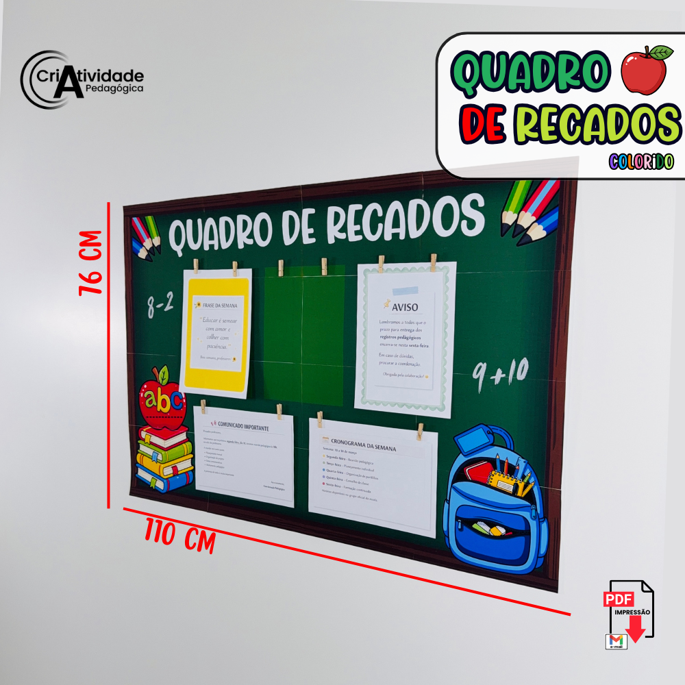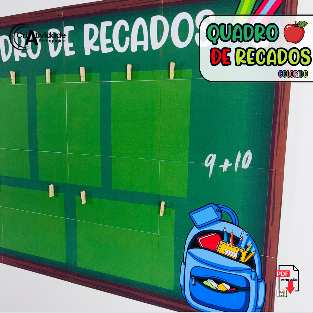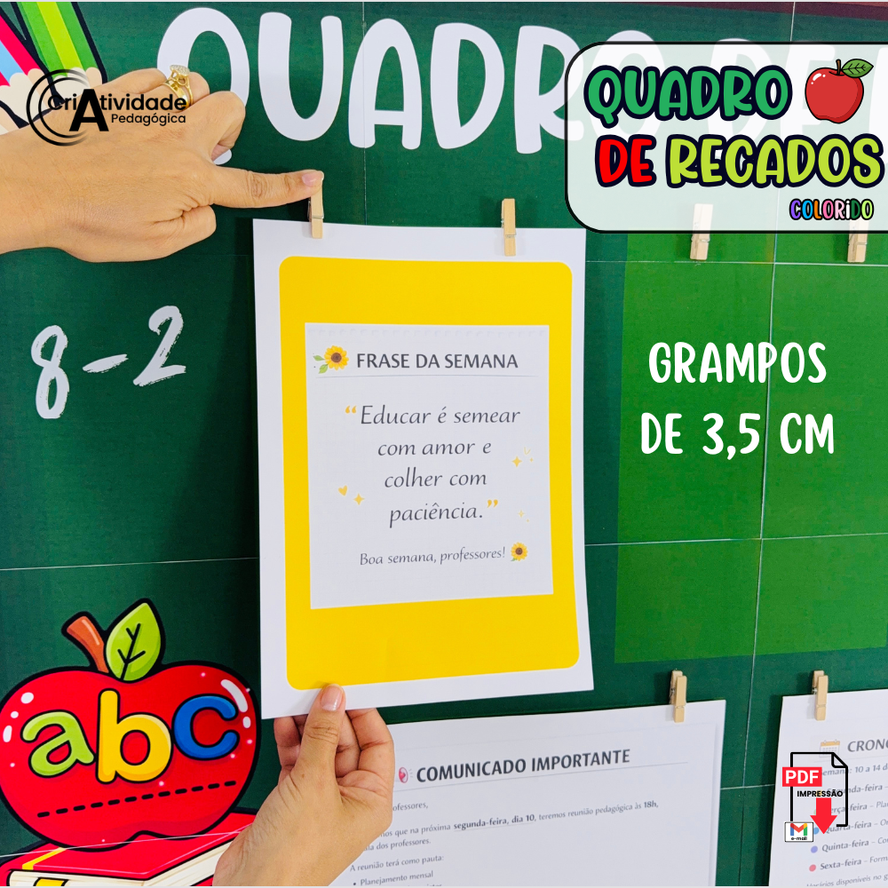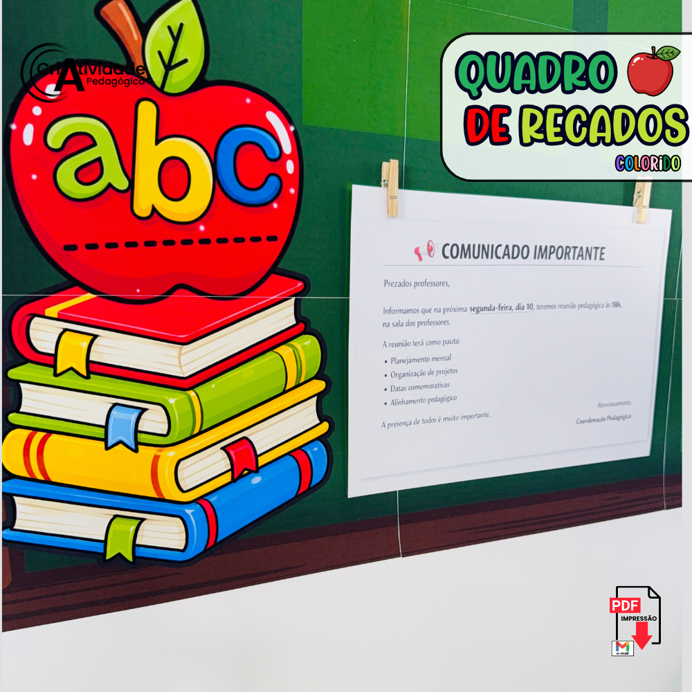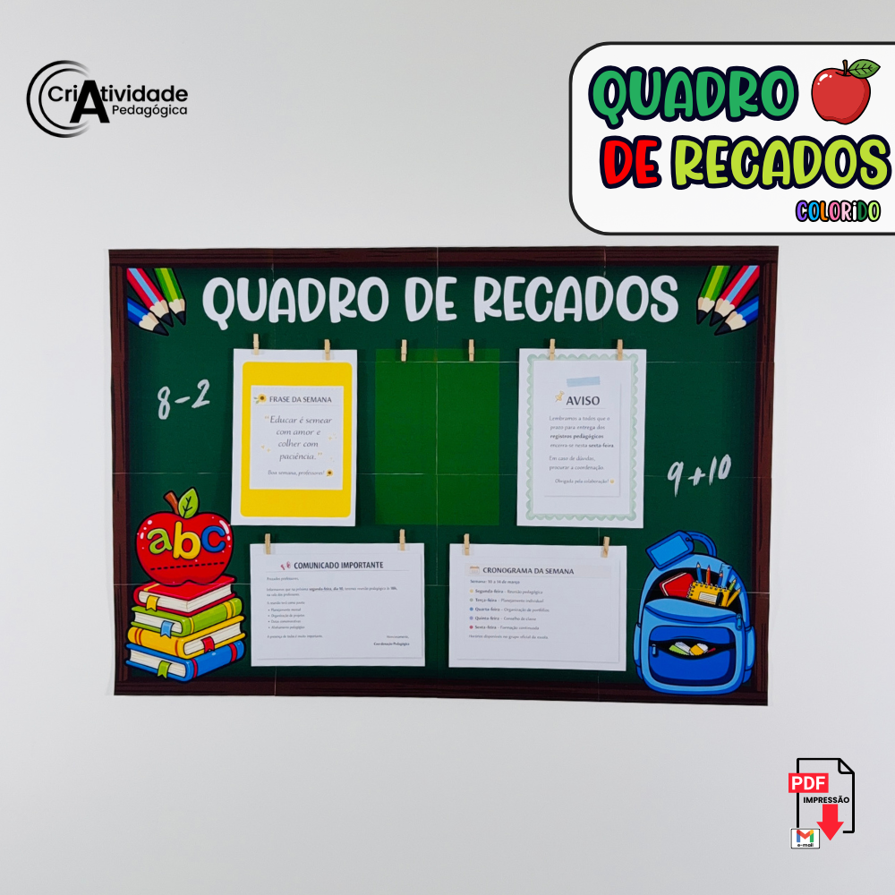 O Quadro de Recados é um recurso digital em PDF, pronto para aplicar e muito fácil de usar no começo das aulas. Desenvolvido para organizar comunicados de forma prática e visual, o quadro permite prender papéis com grampo, criando um espaço funcional e decorativo. Ideal para sala de aula, sala dos professores, coordenação ou corredores, facilita a comunicação do dia a dia escolar. Seu design transforma simples avisos em um lindo quadro de recados, valorizando o ambiente. Com proposta prática, o material já vem pronto para impressão e montagem. Disponível em versão colorida, garante um visual organizado e acolhedor. Produzido com alta qualidade visual, é um recurso essencial para manter todos bem informados.