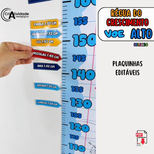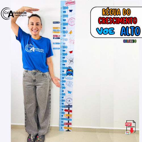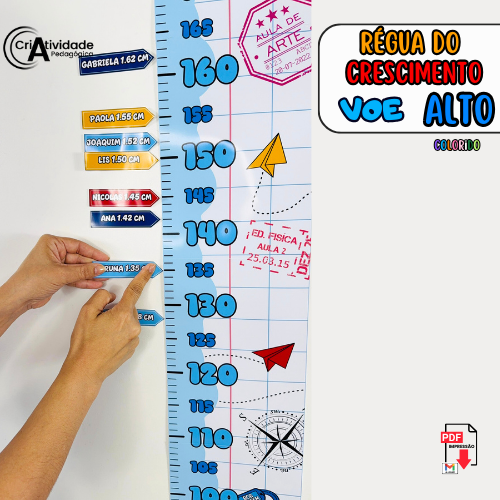 A Régua do Crescimento Voe Alto é um recurso digital em PDF, pronto para aplicar e muito fácil de usar em sala de aula. O painel, em formato de régua, permite medir a altura das crianças, registrando seu desenvolvimento ao longo do ano letivo. Acompanha setinhas editáveis para inserir o nome do aluno e marcar sua altura, possibilitando comparar o crescimento no início e no final do ano. Com visual inspirado no tema Voe Alto, o material torna esse momento ainda mais especial e motivador. Ideal para projetos de acompanhamento, murais interativos e registros escolares. Em versão colorida, é prático para impressão e montagem. Produzido com alta qualidade visual e pedagógica, transforma a observação do crescimento em uma experiência encantadora.