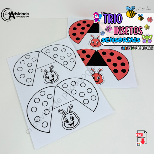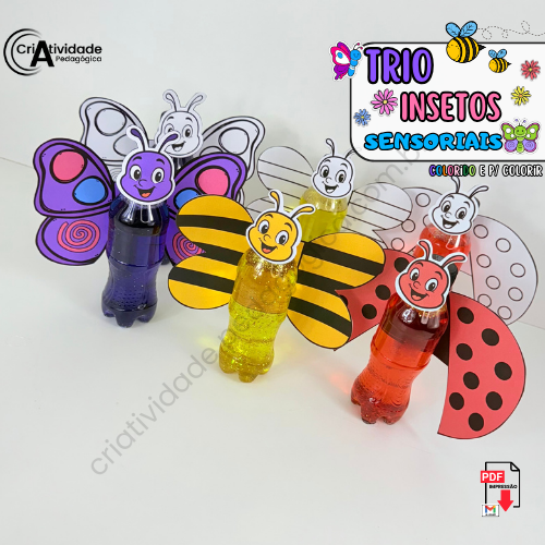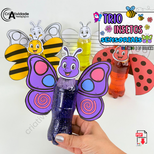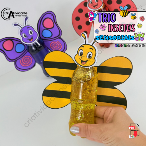 O Trio de Insetos Sensoriais é um recurso criativo e encantador que utiliza garrafinhas PET para representar os corpos da abelha, borboleta e joaninha, promovendo interação sensorial e visual. Cada garrafinha é preenchida com água, corante, glitter e outros itens leves para criar um efeito mágico e estimulante. Complementando, asas e rostinhos transformam as garrafinhas em adoráveis insetos, tornando essa atividade educativa, artística e lúdica. Um jeito simples e sustentável de explorar a natureza com as crianças!