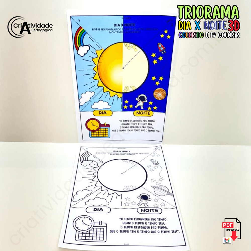 O “Triorama Dia x Noite” oferece uma abordagem criativa para explorar os ciclos do dia e da noite, permitindo que os alunos montem e personalizem seus próprios cenários. (Material em PDF, fácil de imprimir, ideal para atividades educativas que combinam ciência e arte).